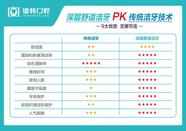 與傳統(tǒng)潔牙相比,深層舒適潔牙的優(yōu)勢(shì)突出: