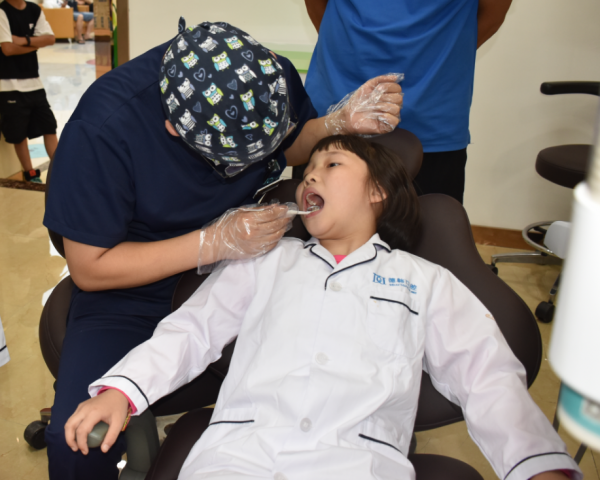 在醫(yī)生的幫助下,小業(yè)主們變身為“小牙醫(yī)”,為到場家長們檢查牙齒。在醫(yī)生的指導(dǎo)下,“小牙醫(yī)”學(xué)以致用,有模有樣地給自己的爸爸媽媽檢查牙齒,并告訴他們牙齒存在的問題。