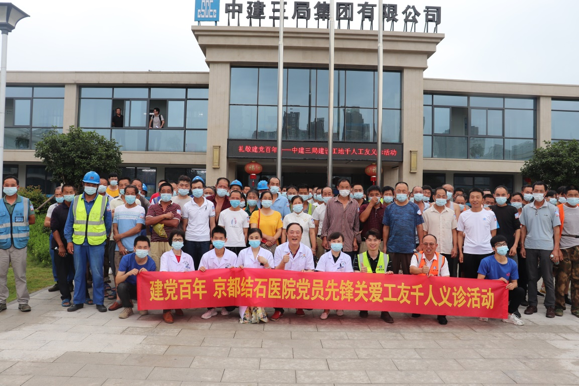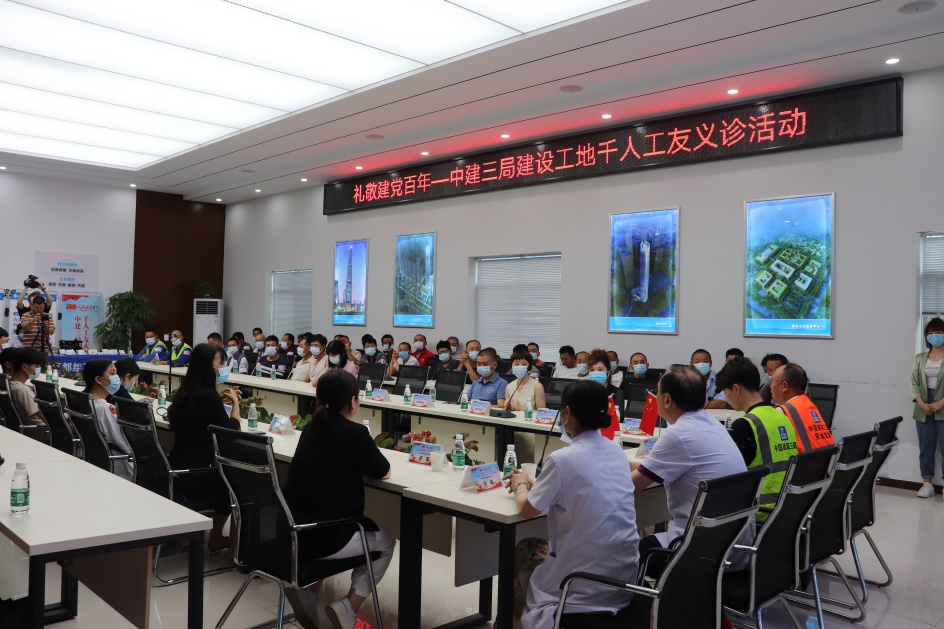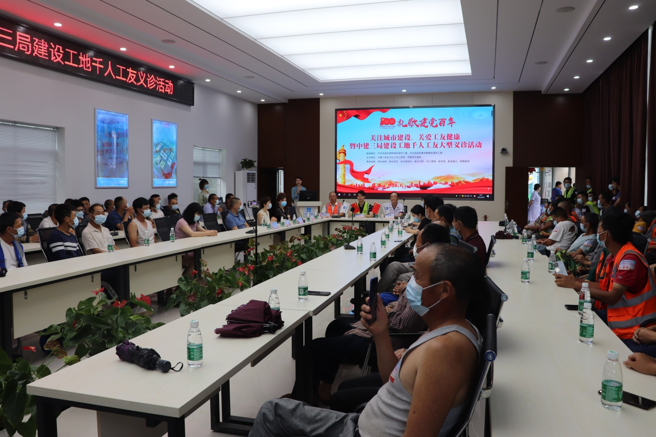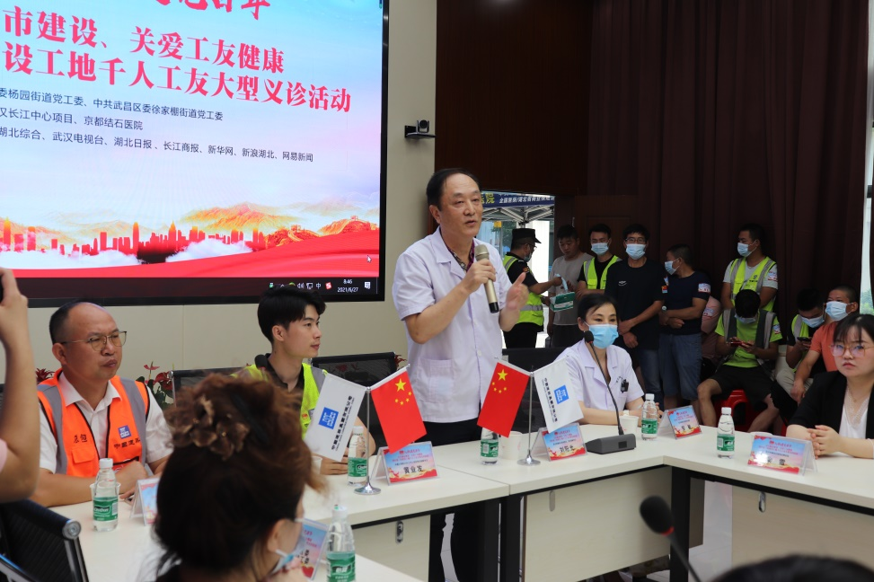 為熱烈慶祝中國共產(chǎn)黨建黨100周年,扎實推進(jìn)黨史學(xué)習(xí)教育,踐行“我為群眾辦實事”實踐活動,切實關(guān)愛建筑工友的身體健康,6月27日上午,中建三局武漢長江中心項目聯(lián)合武漢京都結(jié)石醫(yī)院,開展“關(guān)注城市建設(shè)·關(guān)愛工友健康”千人工友大型義診活動(以下簡稱“千人義診”活動)。中建三局武漢長江中心項目黨支部副書記黃業(yè)發(fā)、安全總監(jiān)黎長貴,武漢京都結(jié)石醫(yī)院黨支部書記劉陽光以及數(shù)百名建筑工人代表共同出席了啟動儀式。