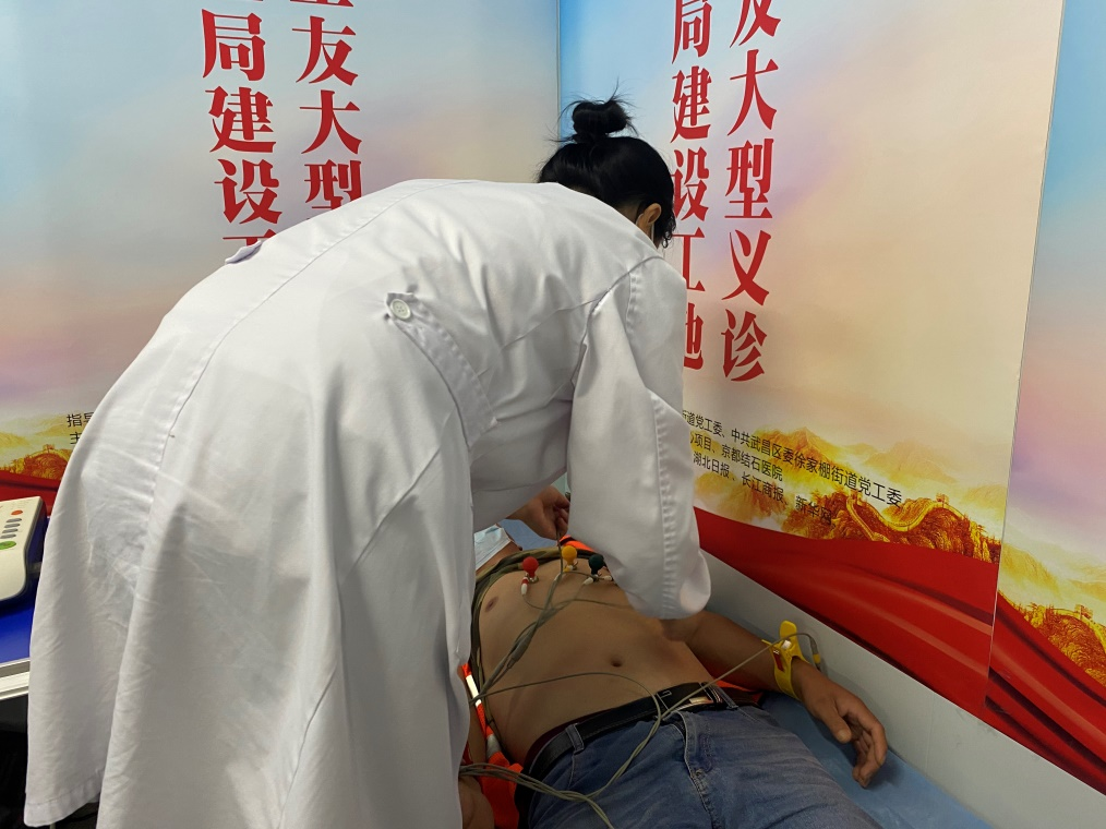 “建筑工人常年從事體力勞動,且長期處于露天作業(yè)當(dāng)中,出汗量大,如不及時補充水分,很容易患上泌尿系結(jié)石相關(guān)疾病。而夏季又是泌尿系結(jié)石的高發(fā)期,一旦結(jié)石急性發(fā)作,不僅會引起劇烈的腎絞痛影響作業(yè)安全,而且結(jié)石梗阻時間過長引起的積水問題還會給腎臟帶來嚴(yán)重?fù)p害,重則危及生命。除此之外,高溫之下,由于人體大量排汗,體內(nèi)水分流失多,使血液黏稠度上升,血液循環(huán)受阻,很容易誘發(fā)血栓、心梗、冠心病、中風(fēng)等心腦血管疾病,導(dǎo)致猝死事件發(fā)生。”武漢京都結(jié)石醫(yī)院黨支部書記劉陽光向記者介紹到,為了預(yù)防夏季高溫季節(jié),腎結(jié)石和心梗這兩大高頻高危疾病的發(fā)生,醫(yī)院特別召集兩組隊伍,分別為現(xiàn)場的廣大工友們提供全程免費結(jié)石彩超篩查及心電圖檢查、血壓、心率等項目。